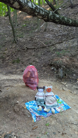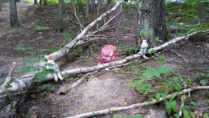 Но сегодня мы пришли сюда не только для прогулки, а для добрых дел: мы прошлись по тропе и собрали целый мешок мусора: фантики, бутылки, даже один носок (не наш!).